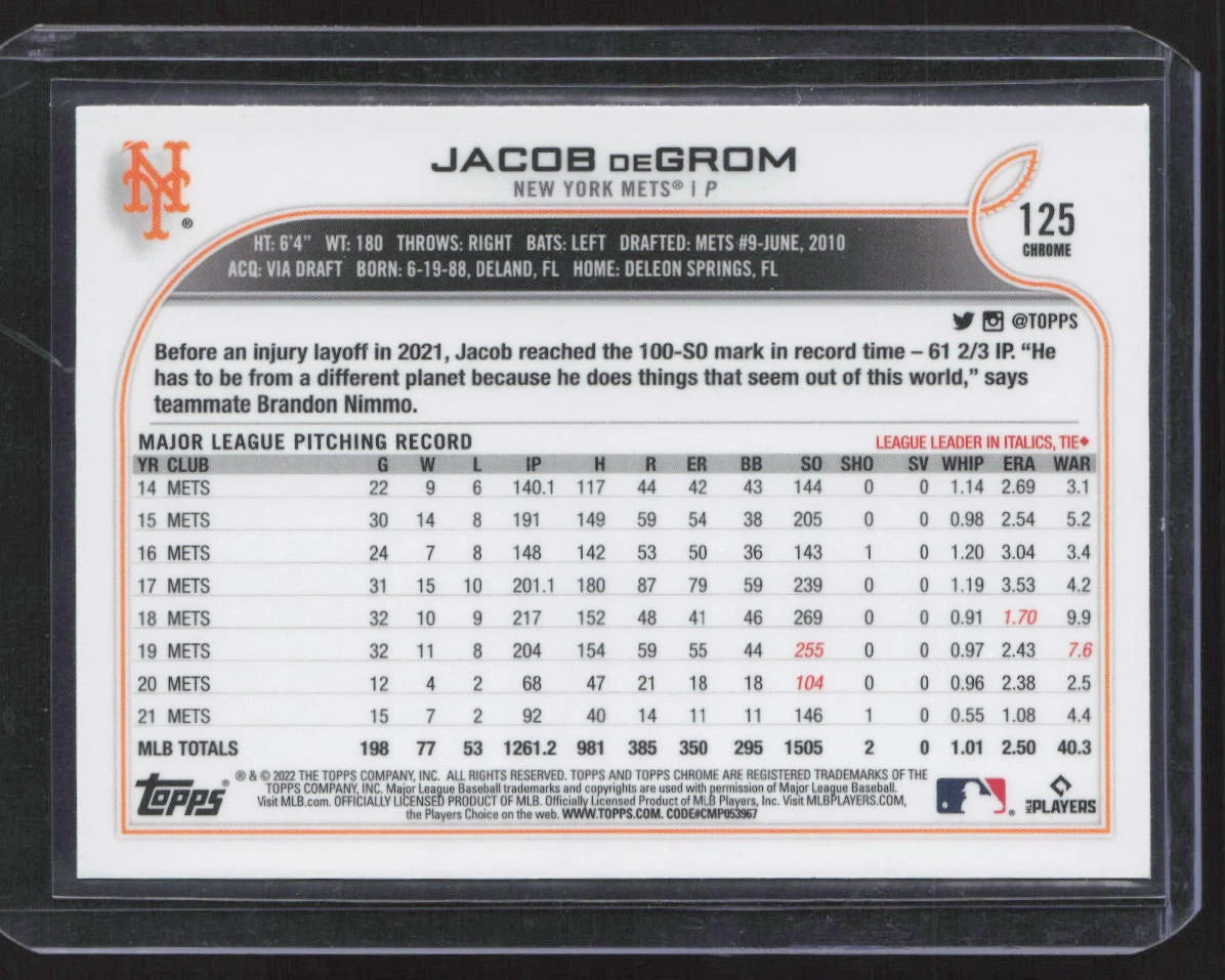 Jacob deGrom 2022 Topps Chrome Sepia Refractor Series Mint Card #125