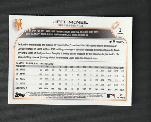Jeff McNeil 2022 Topps Chrome Sepia Refractor Series Mint Card #2