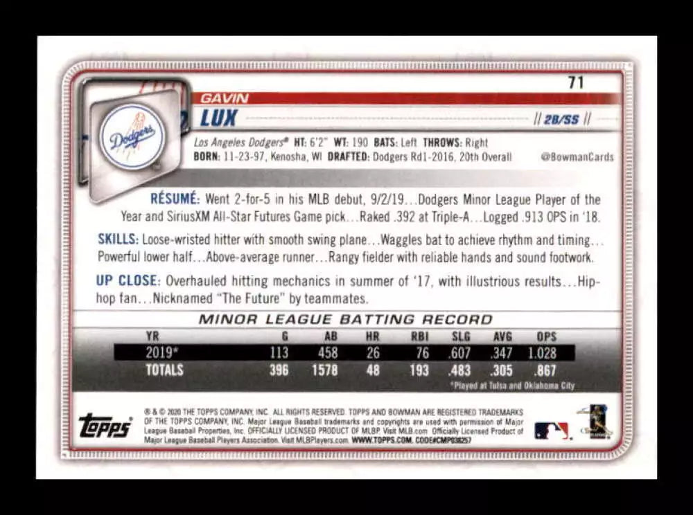 Gavin Lux 2020 Bowman Series Mint Rookie Card #71