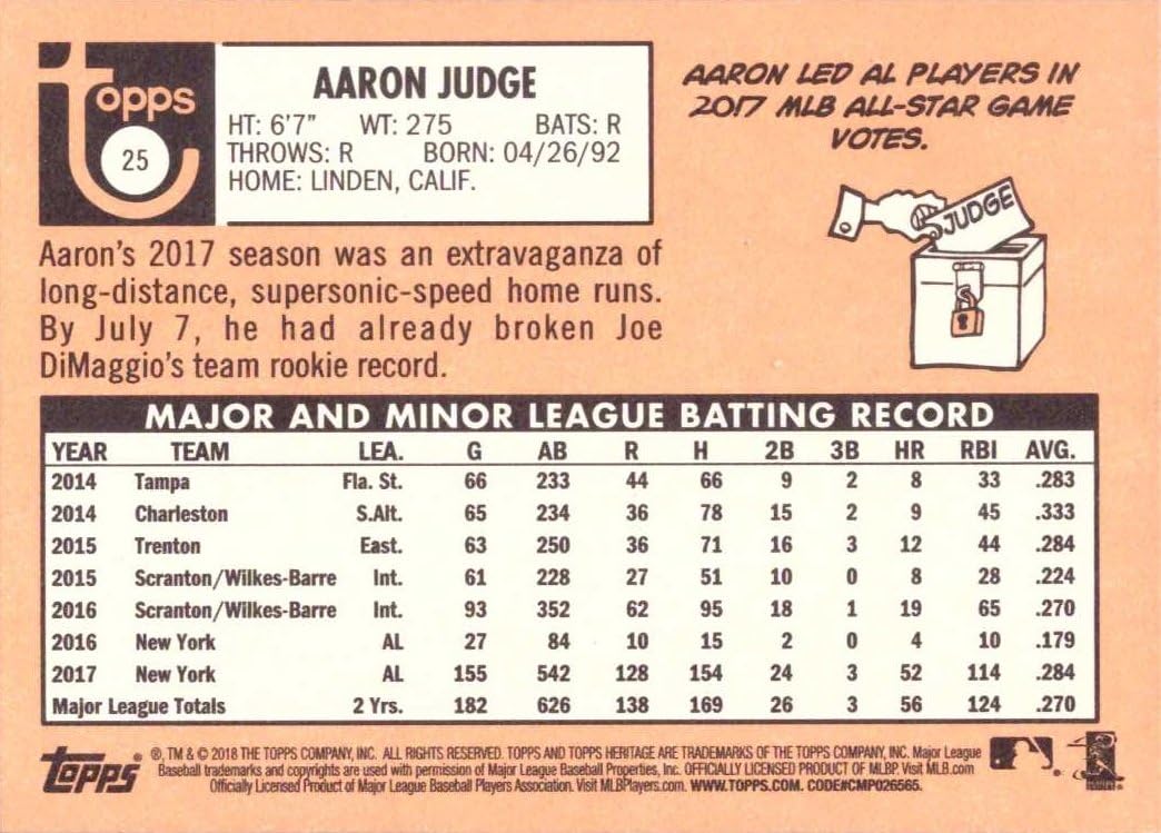 Aaron Judge 2018 Topps Heritage Series 2017 All-Star Rookie Mint 2nd Year Card #25