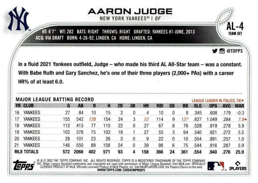 Aaron Judge 2022 Topps American League All-Stars Limited Edition Card #AL-4 picturing this New York Yankees Star is his White Pinstriped Jersey.  This card is found EXCLUSIVELY in the Topps American League All-Stars Factory Sealed Sets.  Very hard single to find as it is not available in any packs, just these Limited Edition sets.