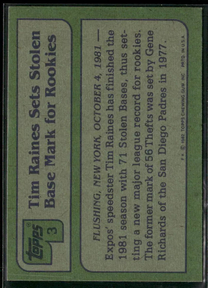 Tim Raines 1982 Topps Highlight Series Mint Card #3
