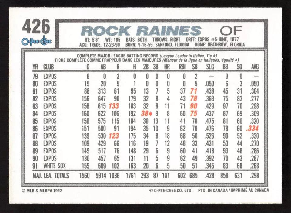 Tim Raines 1992 O-Pee-Chee Series Mint Card #426