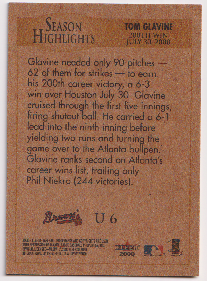 Tom Glavine2000 Fleer Tradition Update Series Mint Card  #U6