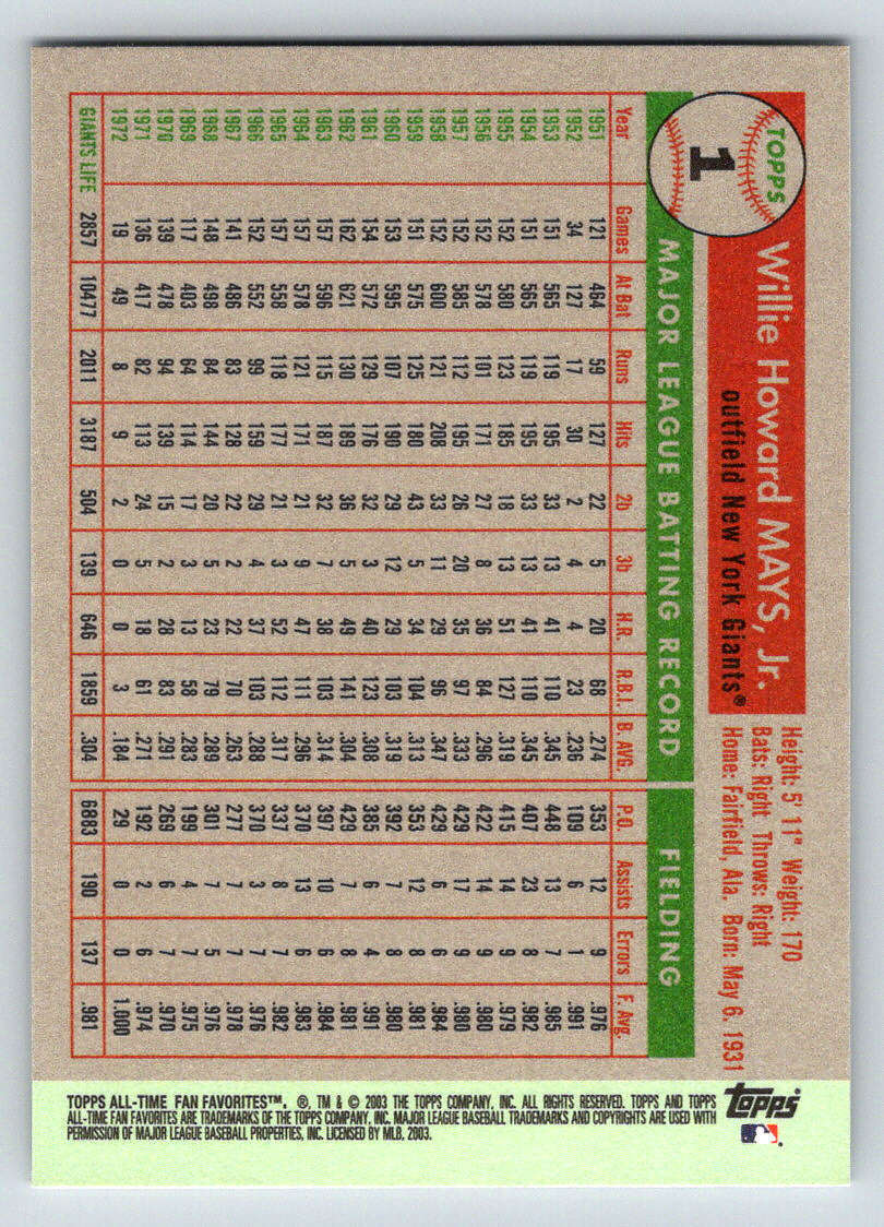 Willie Mays 2003 Topps All-Time Fan Favorites Series Mint Card #1