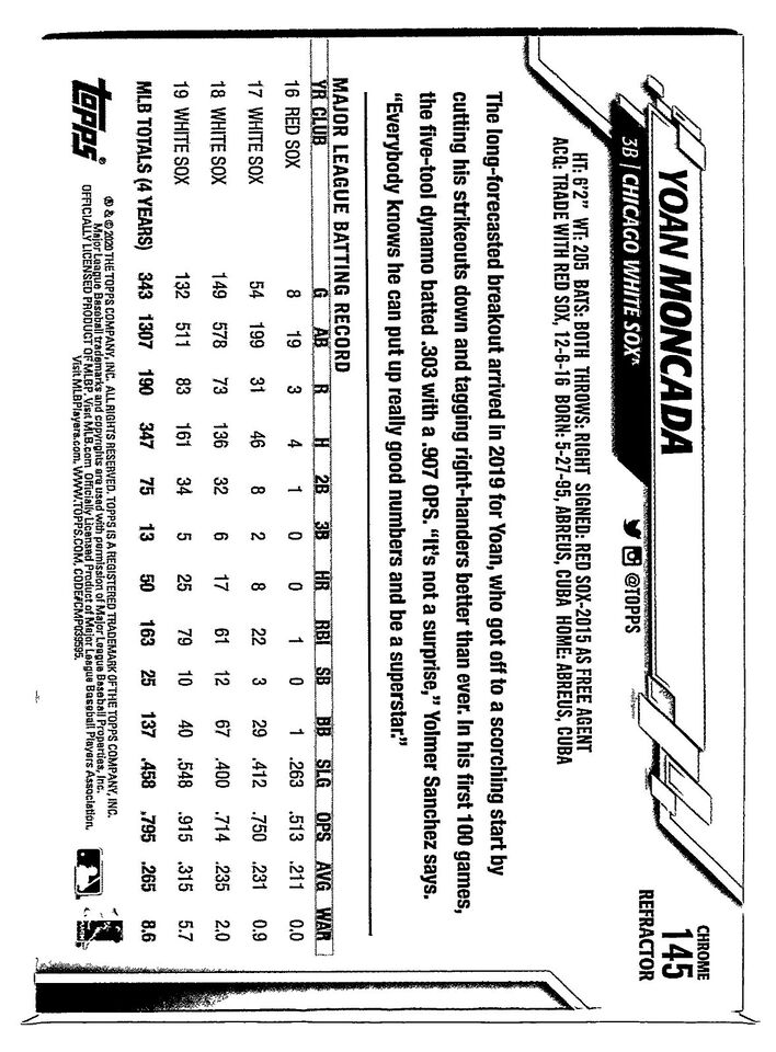 Yoan Moncada 2020 Topps Chrome Sepia Refractor Series Mint Card #145