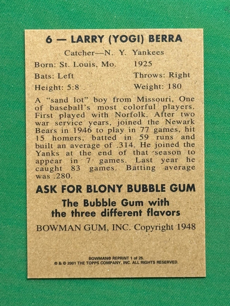 Yogi Berra 2001 Bowman Baseball Rookie Reprints 1948 Series Card #6