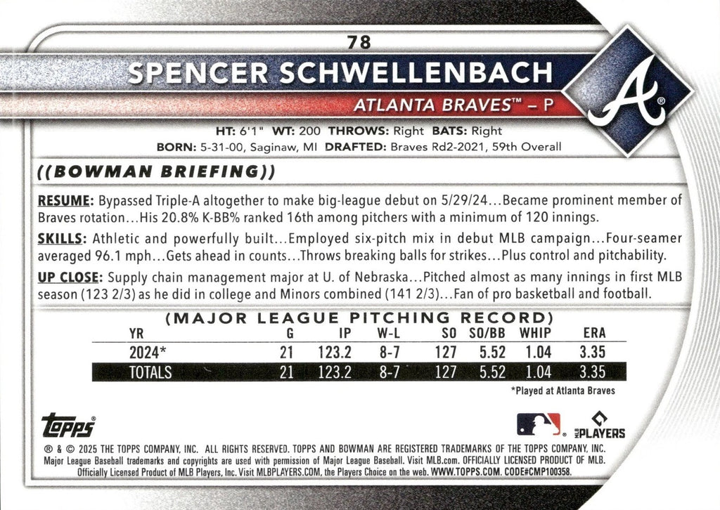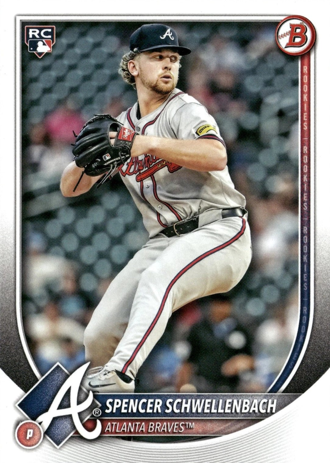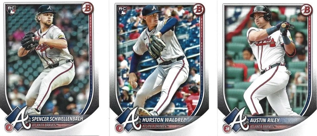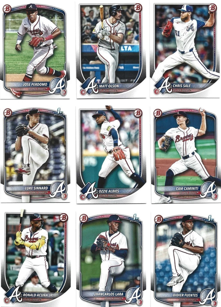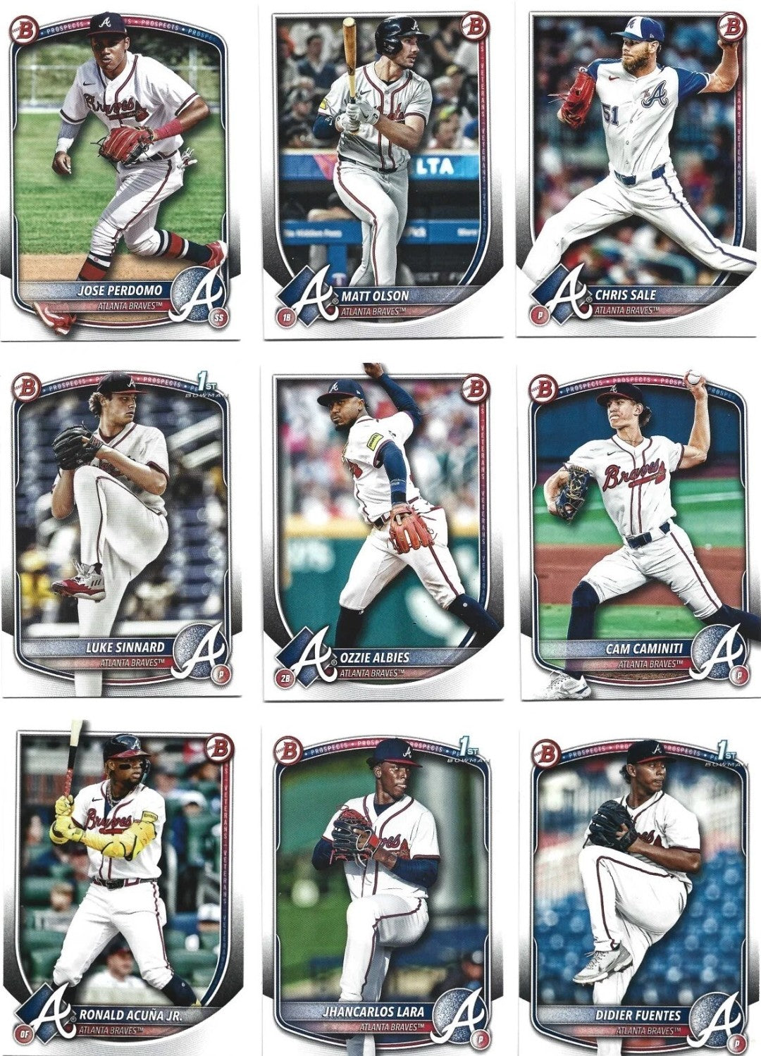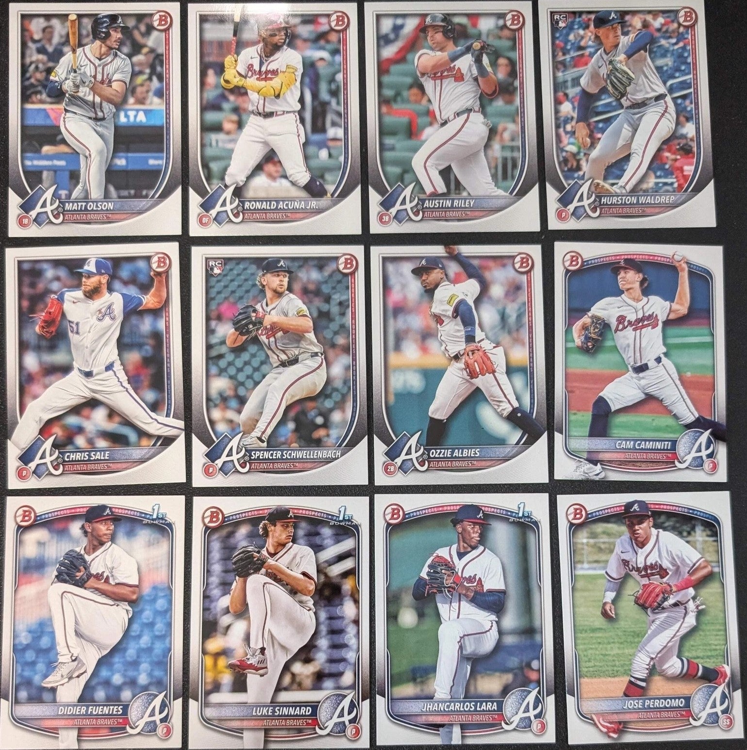 Atlanta Braves 2025 Bowman Complete Mint 12 Card Team Set made by Topps with Stars Austin Riley, Matt Olson, Chris Sales and Ronald Acuna Jr., Plus Spencer Schwellenbach Rookie and 5 Top Prospect Cards