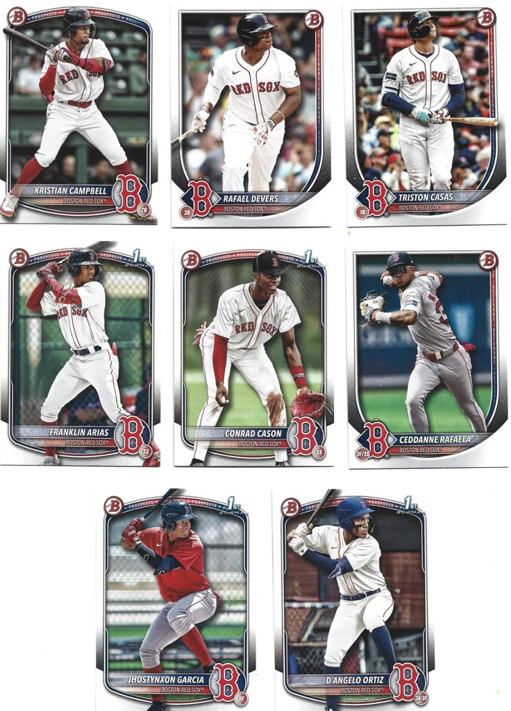 This is a Boston Red Sox 2025 Bowman Baseball Series complete mint basic 8 card team set made by Topps; it was never issued in factory form. Cards included are Rafael Devers, Triston Casas and Ceddanne Rafaela plus Prospect Cards of Kristian Campbell, Jhostynxon Garcia, D’Angelo Ortiz, Franklin Arias and Conrad Cason.