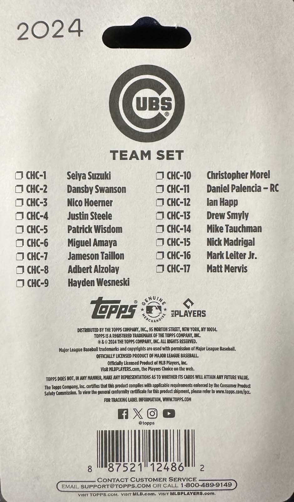 Chicago Cubs 2024 Topps Factory Sealed 17 Card Team Set with Dansby Swanson and a Daniel Palencia Rookie Card Plus