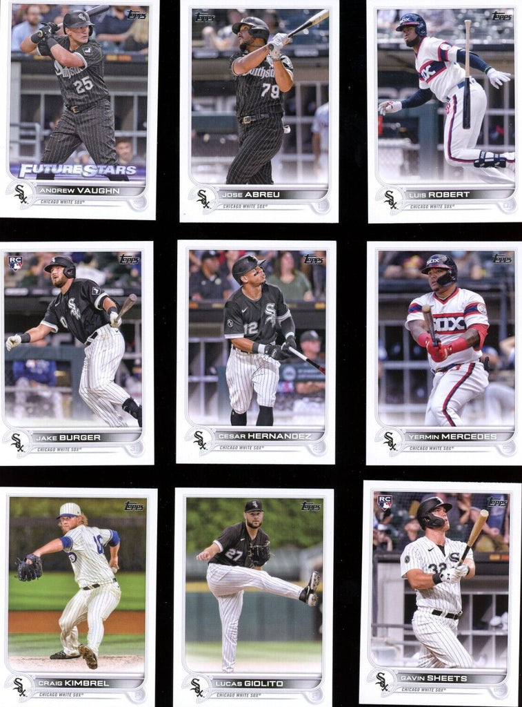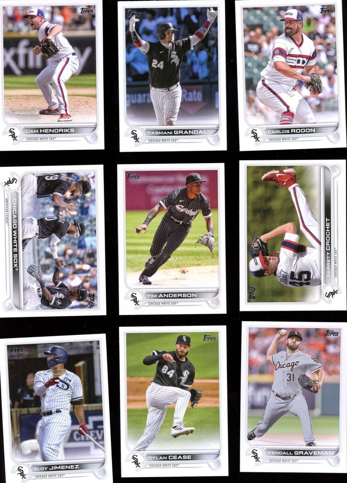 This is a 2022 Topps Chicago White Sox complete Mint Hand Collated 25 Card Team Set; it was never issued in factory form. It contains all White Sox cards from series #1 and #2 including #2 Craig Kimbrel, #12 Gavin Sheets Rookie Card, #28 Cesar Hernandez, #64 Tim Anderson, #84 Jose Abreu, #107 Luis Robert, #120 Andrew Vaughn Future Stars, #141 Yermin Mercedes, #186 Jake Burger Rookie Card, #239 Garrett Crochet, #255 Chicago White Sox Team Card, #268 Liam Hendriks, #282 Carlos Rodon, #284 Yasmani Grandal, #291 Lucas Giolito, #348 Leury Garcia, #351 Zack Collins, #372 Yoan Moncada, #424 Dallas Keuchel, #433 Dylan Cease, #460 Lance Lynn, #500 Eloy Jimenez, #515 Kendall Graveman, #595 Romy Gonzalez Rookie Card and #616 Michael Kopech.