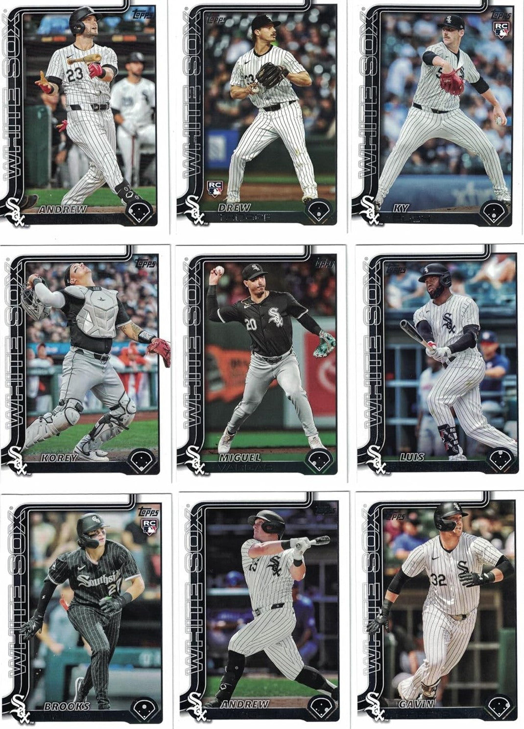 This is a 2025 Topps Chicago White Sox complete mint hand collated 18 card team set; it was never issued in factory form. It contains all White Sox cards from series #1 and #2 including Gavin Sheets, Andrew Vaughn, Luis Robert Jr, Miguel Vargas, Korey Lee,