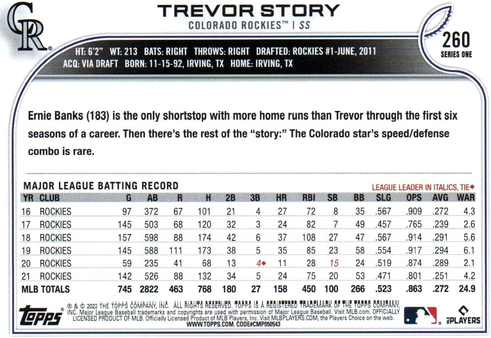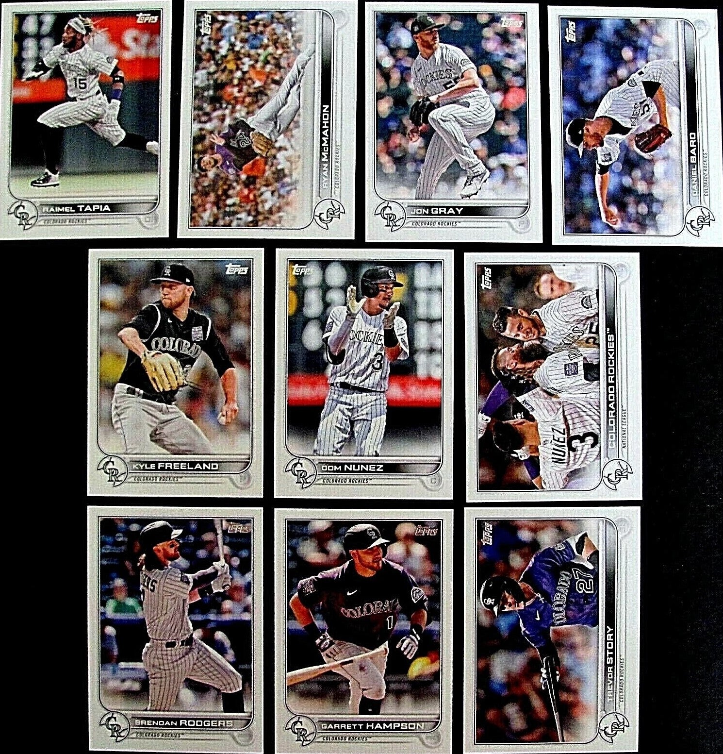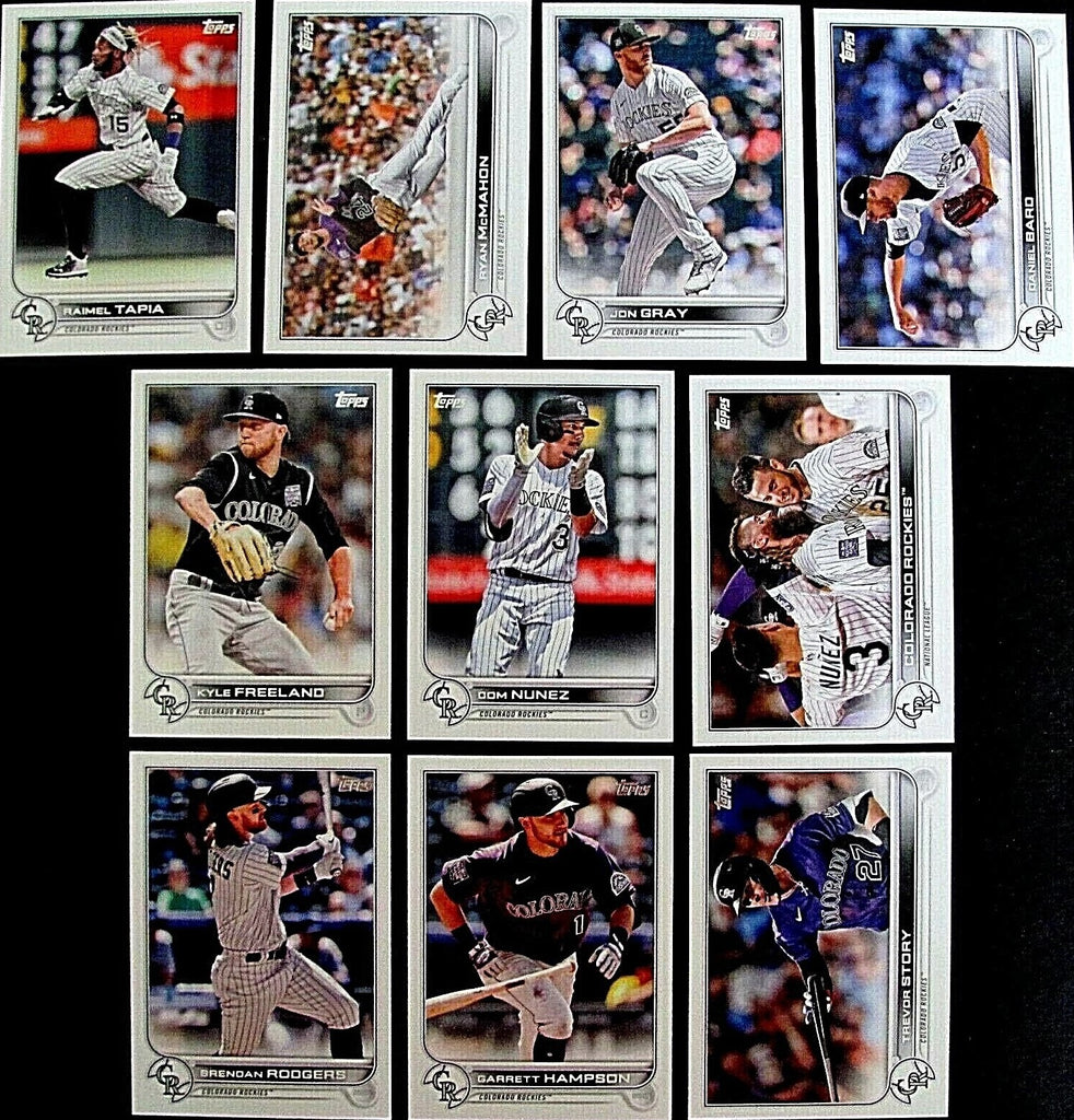 This is a 2022 Topps Colorado Rockies complete mint hand collated 20 card team set; it was never issued in factory form. Players included are Charlie Blackmon, Yonathan Diaz, German Marquez, Antonio Senzatela, Elias Diaz, Chris Owings, Austin Gomber, Trevor Story, Ryan McMahon, Daniel Bard, Jon Gray, Raimel Tapia, Brendan Rodgers, Dom Nunez, Kyle Freeland, Garrett Hampson, a Colorado Rockies Team card and Rookie Cards of Ryan Vilade, Ryan Feltner and Colton Welker.