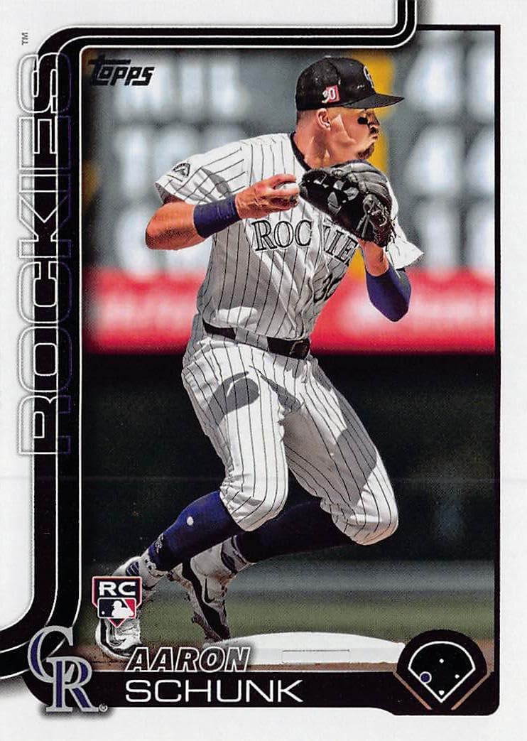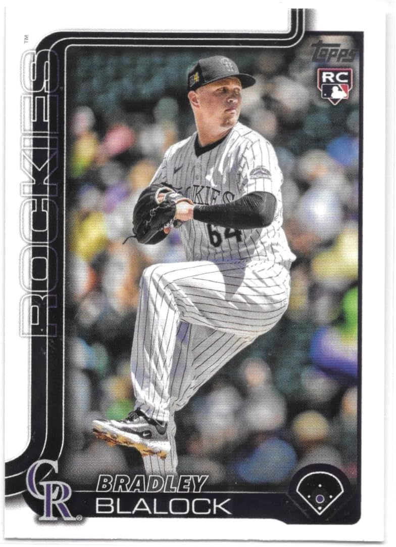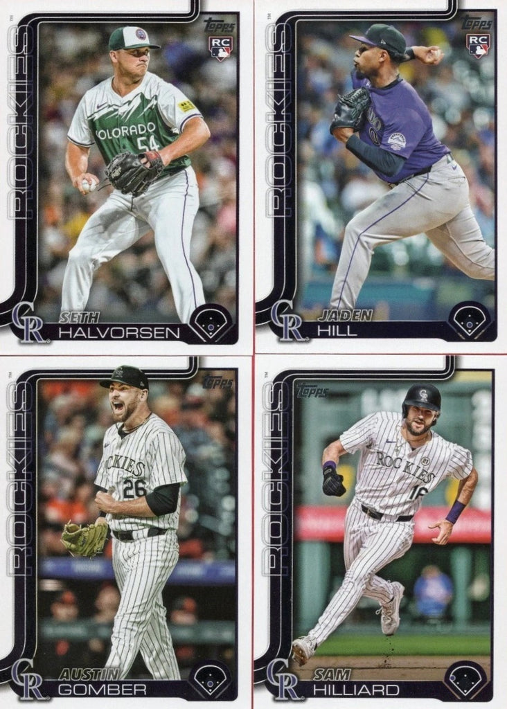 This is a Colorado Rockies 2025 Topps Complete Mint Hand Collated 25 Card Team Set; it was never issued in factory form. It contains all Rockies cards from series #1 and #2 featuring 9 Rookie Cards: Greg Jones, Bradley Blalock, Adael Amador, Aaron Schunk, Drew Romo, Angel Chivilli, Luis Peralta, Jaden Hill and Seth Halvorsen with Brenton Doyle, Michael Toglia, Jordan Beck, Jake Cave, Cal Quantrill, Charlie Blackmon, Ezequiel Tovar, Ryan McMahon, Nolan Jones, Kris Bryant, Kyle Freeland, Ryan Feltner, Hunter Goodman, Sam Hilliard, Austin Gomber and a Colorado Rockies Team Card.
