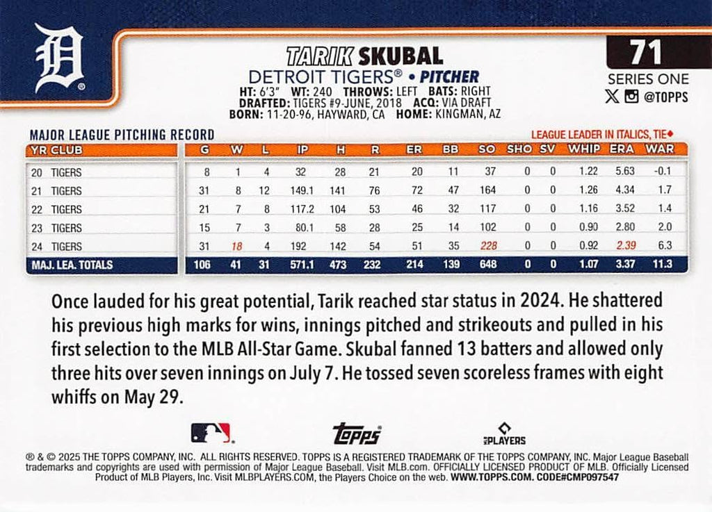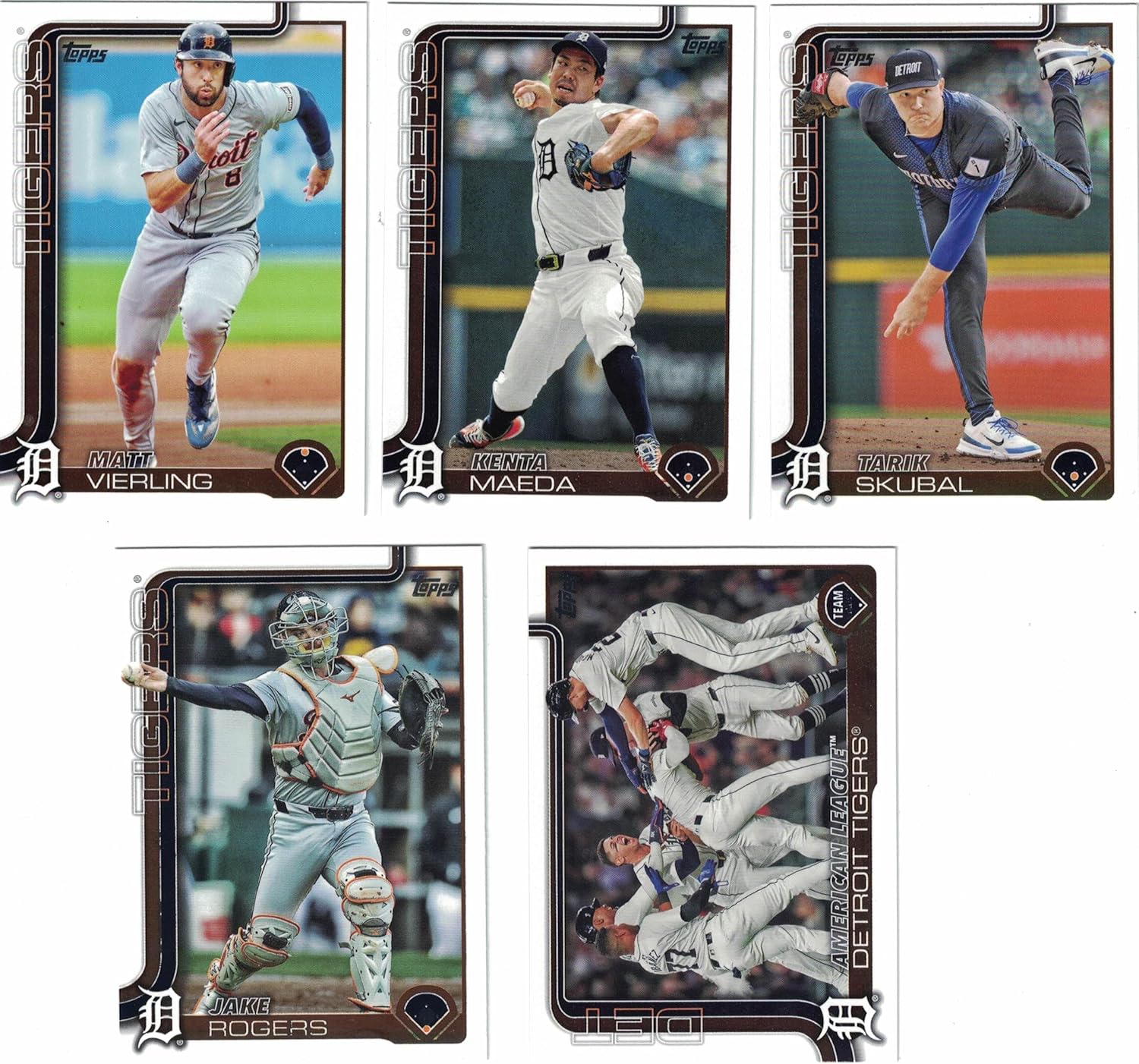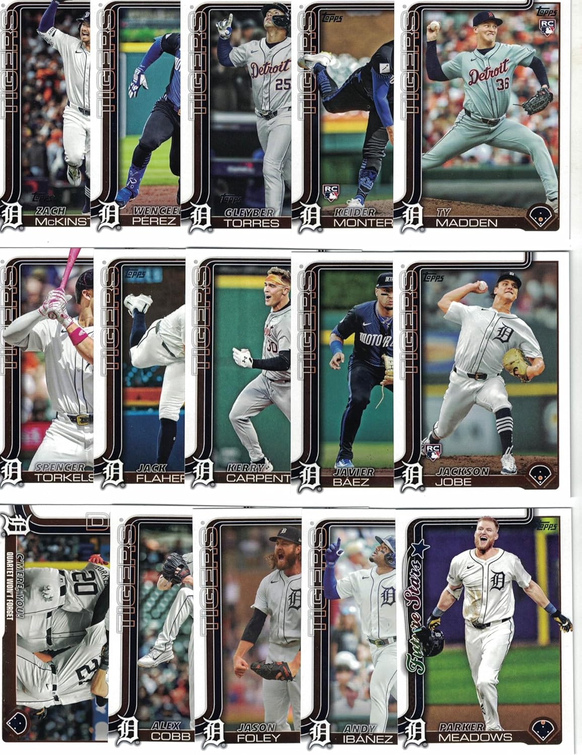 This is a 2025 Topps Detroit Tigers complete mint 29 card team set; it was never issued in factory form. It contains all Tigers cards from series #1 and #2 featuring Tarik Skubal, Kenta Maeda, Matt Vierling, Colt Keith, Reese Olson, Jake Rogers, Casey Mize, Riley Greene, Alex Cobb, Jason Foley, Andy Ibáñez, Spencer Torkelson, Jack Flaherty, Kerry Carpenter, Javier Báez, Zach McKinstry, Parker Meadows Future Stars, Wenceel Pérez, Gleyber Torres, C'mere, you! Checklist card, a Detroit Tigers Team Card and Rookie Cards of Trey Sweeney, Jace Jung, Dillon Dingler, Justyn-Henry Malloy, Brant Hurter, Ty Madden, Jackson Jobe and Keider Montero.