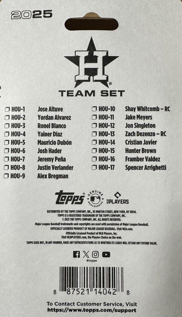 Houston Astros 2025 Topps Factory Sealed 17 Card Team Set Featuring Jose Altuve, Yordan Alvarez and Justin Verlander with Rookie Cards of Shay Witcomb and Zach Dezenzo Plus