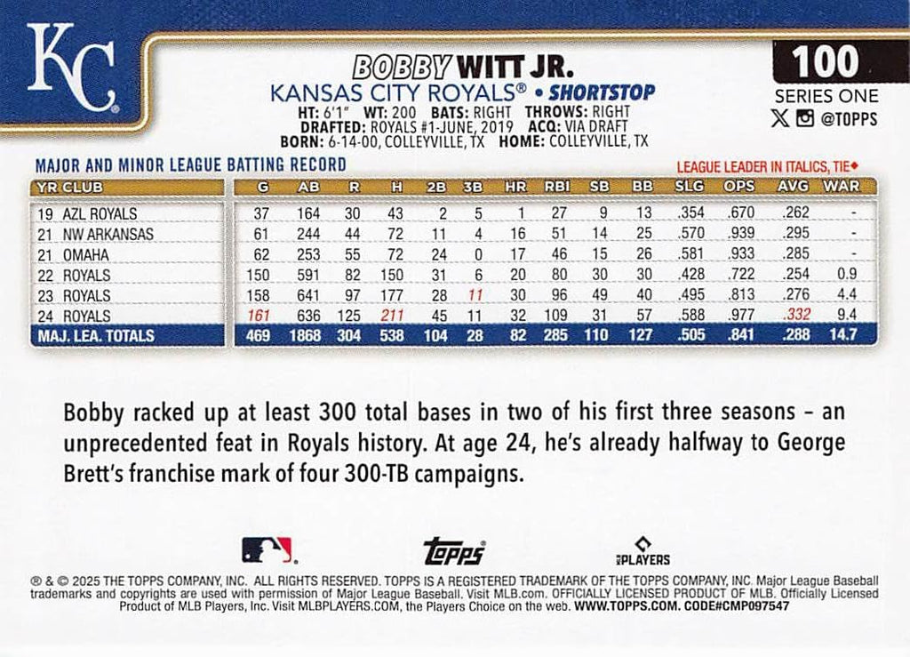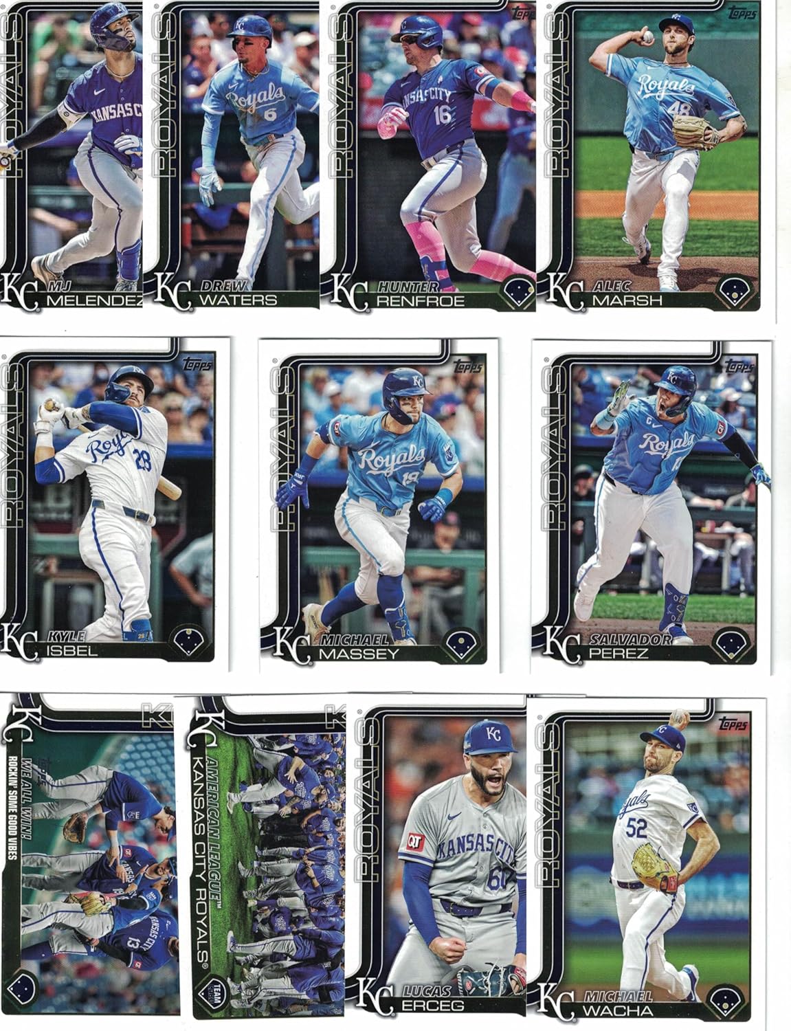 Kansas City Royals 2025 Topps Complete Mint 19 Card Hand Collated Team Set Featuring Salvador Perez and Bobby Witt Jr with a Tyler Gentry Rookie Card Plus