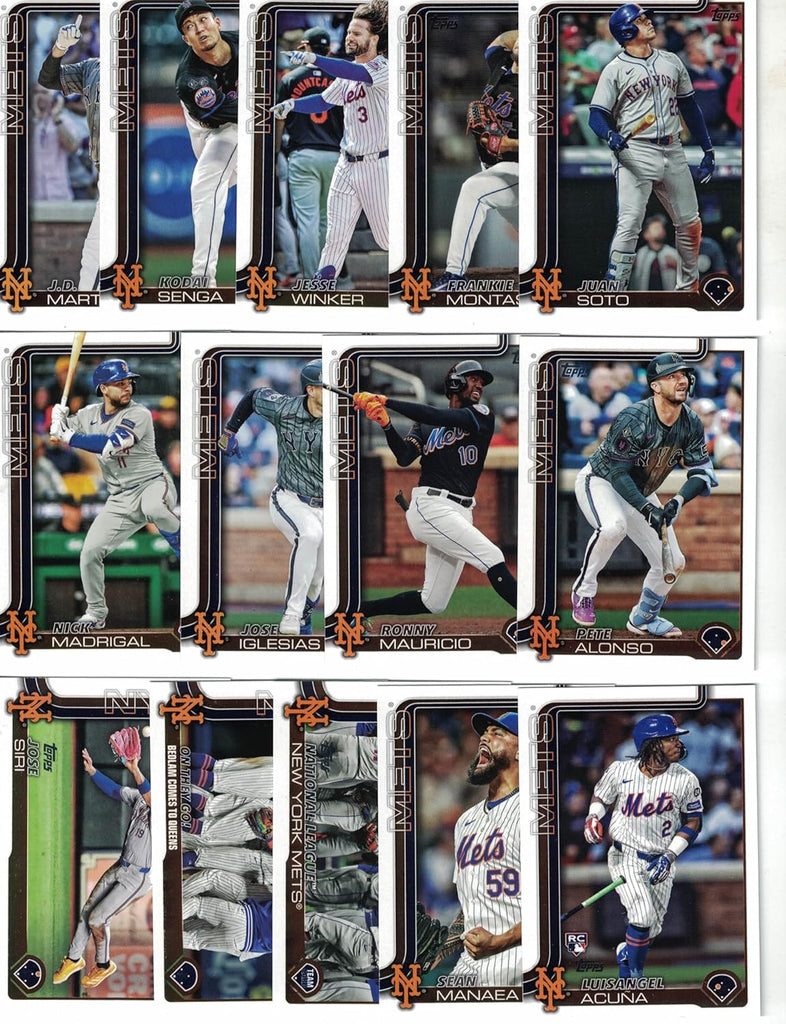 This is a New York Mets 2025 Topps Complete Mint Hand Collated 24 Card Team Set; it was never issued in factory form. It contains all Mets cards from series #1 and #2 featuring Francisco Lindor, Pete Alonso, Juan Soto, David Peterson, Jeff McNeil, Francisco Alvarez, Starling Marte, Mark Vientos, Tyrone Taylor, Edwin Díaz, Paul Blackburn, Brandon Nimmo, Sean Manaea, Nick Madrigal, Jose Siri, Jose Iglesias, On They Go! CL, Ronny Mauricio, J.D. Martinez, Kodai Senga, Jesse Winker, Frankie Montas and a New York Mets Team Card plus a Rookie Card of Luisangel Acuña.
