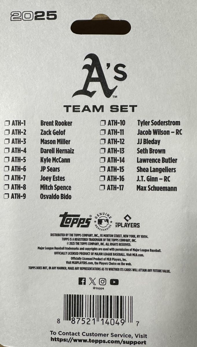 Oakland Athletics 2025 Topps Factory Sealed 17 Card Team Set Featuring Brent Rooker, Zack Gelof and Shea Langeliers with Rookie Cards of Jacob Wilson and J.T. Ginn Plus