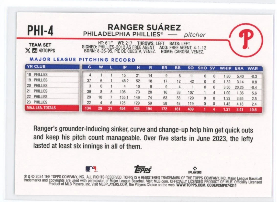 This is a     2024 Topps   Philadelphia Phillies    Hand Collated special edition 17 card team set; cards are numbered PHT-1 through PHT-17 and are not available in packs. Players included are Bryce Harper, Alec Bohm, J.T. Realmuto, Ranger Suarez, Zack Wheeler, Bryson Stott, Brandon Marsh, Kyle Schwarber, Cristopher Sanchez, Trea Turner, Nick Castellanos, Taijuan Walker, Garrett Stubbs, Cristian Pache, Jose Alvarado, Edmundo Sosa  and a Rookie Card of Johan Rojas.