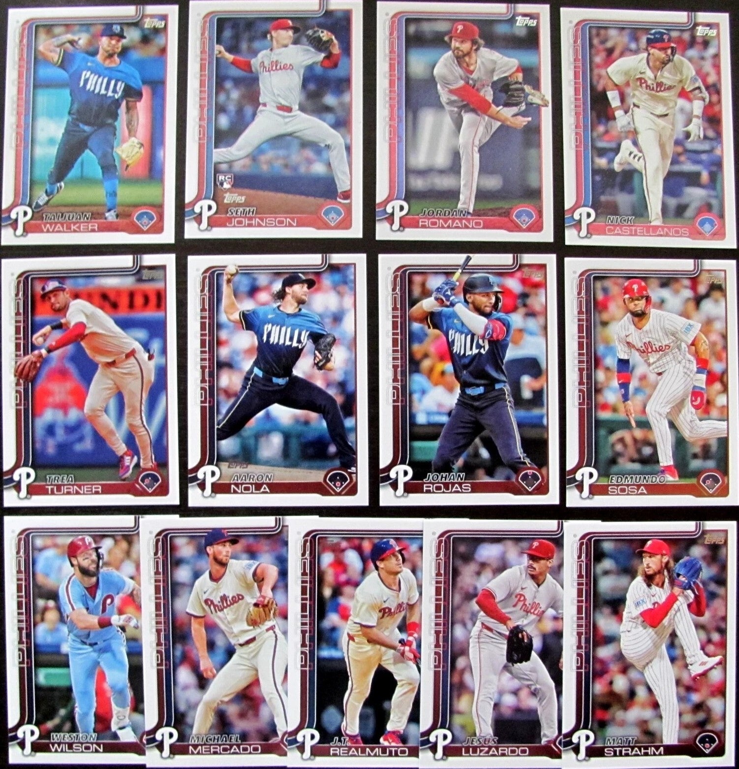 Philadelphia Phillies 2025 Topps Complete Mint 23 Card Team Set Featuring Bryce Harper, Kyle Schwarber and Trea Turner with Rookie Cards of Tyler Phillips, Seth Johnson and Michael Mercado Plus