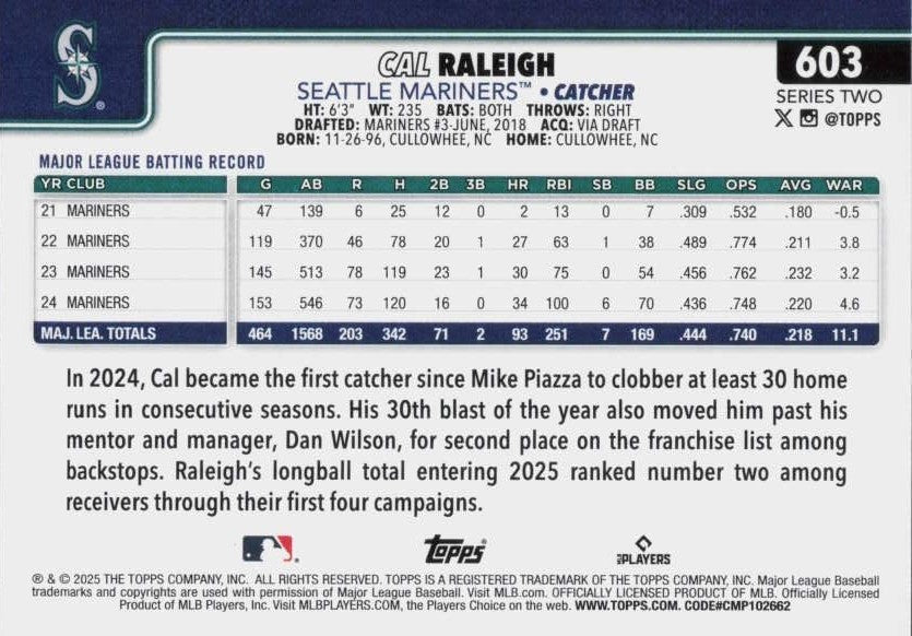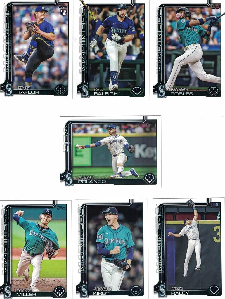 This is a 2025 Topps Seattle Mariners Complete Mint Hand Collated 19 Card team set; it was never issued in factory form. It contains all Mariners cards from series #1 and #2 including Cal Raleigh, Mitch Haniger, Logan Gilbert, Luis Castillo, Dylan Moore, Randy Arozarena, Julio Rodríguez, J.P. Crawford, Bryan Woo, Mitch Garver, Bryce Miller, Jorge Polanco, George Kirby, Luke Raley, Victor Robles, a Seattle Mariners Team Card and Rookie cards of Tyler Locklear, Ryan Bliss and Troy Taylor.