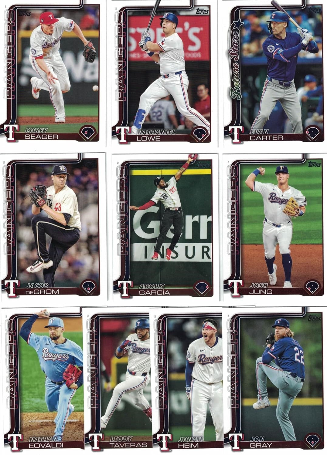 This is a 2025 Topps Texas Rangers  complete mint hand collated 18 card team set; it was never issued in factory form. It contains all Rangers cards from series #1 and #2 featuring Corey Seager, Evan Carter Future Stars card, Marcus Semien, Leody Taveras, Jonah Heim, Jon Gray, Josh Jung, Nathan Eovaldi, Jacob deGrom, Adolis García, Nathaniel Lowe, Wyatt Langford Topps All Star Rookie Cup Card #455, Ezequiel Duran, Josh Smith, a Texas Rangers Team Card and Rookie Cards of Dustin Harris, Kumar Rocker and Walter Pennington.