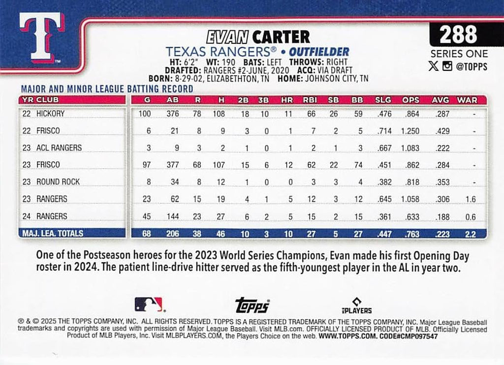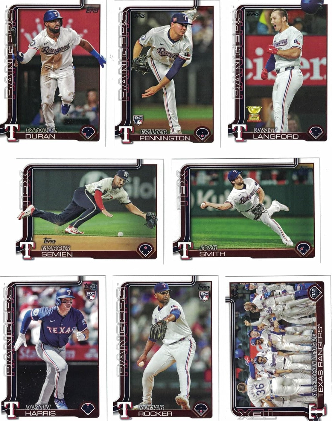 Texas Rangers 2025 Topps Complete Mint 18 Card Hand Collated Team Set Featuring Evan Carter Future Stars, Corey Seager and Marcus Semien with Dustin Harris, Kumar Rocker and Walter Pennington Rookie Cards Plus