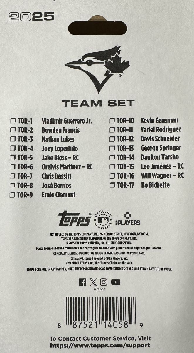 This is a   2025 Topps   Toronto Blue Jays    Factory sealed special edition 17 card team set;   cards are numbered TOR-1 through TOR-17 and are not available in packs. Players included are Vladimir Guerrero Jr, George Springer, Daulton Varsho, Kevin Gausman, Jose Berrios, Bo Bichette, Chris Bassitt, Davis Schneider, Bowden Francis, Nathan Lukes, Joey Loperfido, Ernie Clement, Yariel Rodriguez and Rookie Cards of Jake Bloss, Orelvis Martinez, Leo Jiminez and Will Wagner.