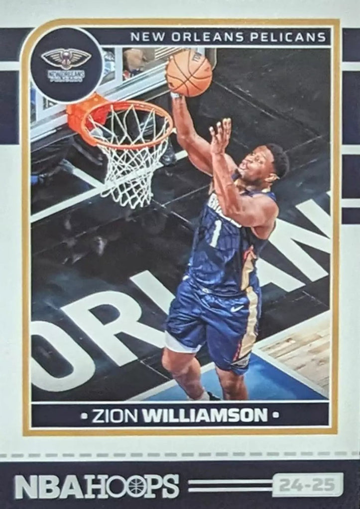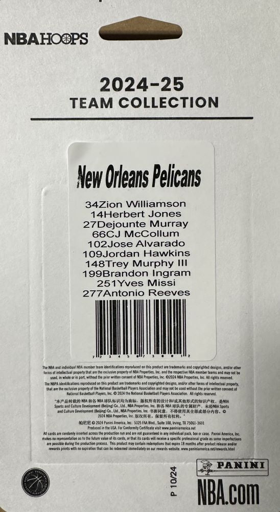 This is a New Orleans Pelicans 2024 2025 Hoops Basketball Brand New Factory Sealed NBA Licensed 10 Card Team Set with Zion Williamson, Herbert Jones, Dejounte Murray, CJ McCollum, Jose Alvarado, Jordan Hawkins, Trey Murphy III, Brandon Ingram and Rookie cards of Yves Missi and Antonio Reeves.