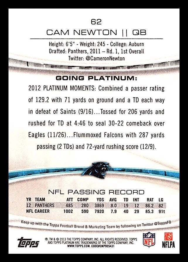 Cam Newton 2013 Topps Platinum Series Mint Card #62
