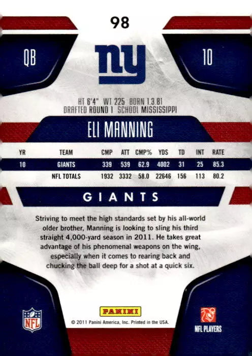 Eli Manning 2011 Leaf Certified Series Mint Card #98