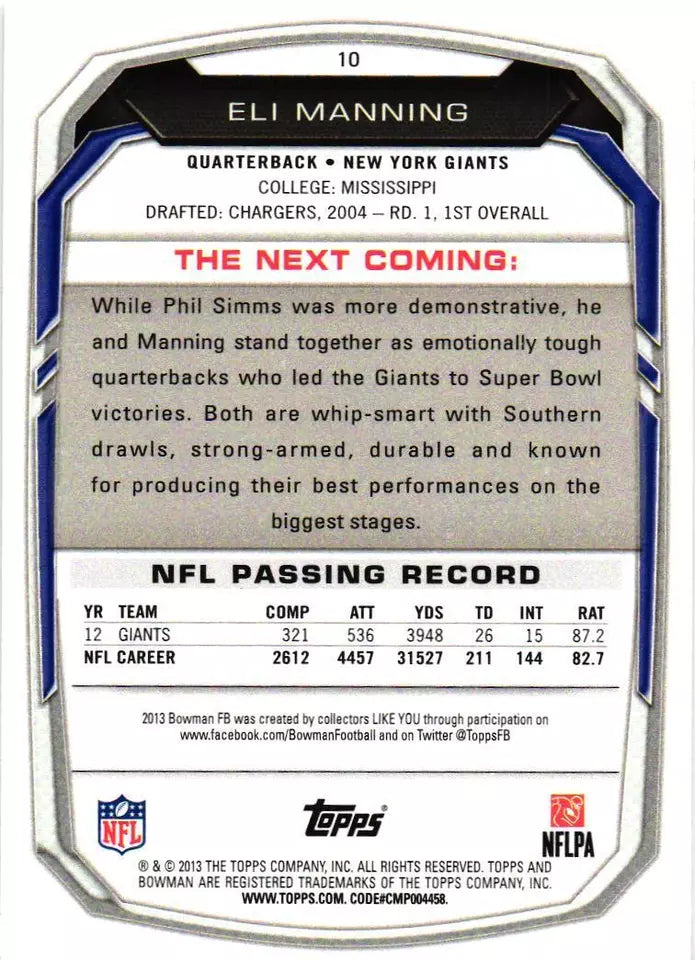 Eli Manning 2013 Bowman Series Mint Card #10