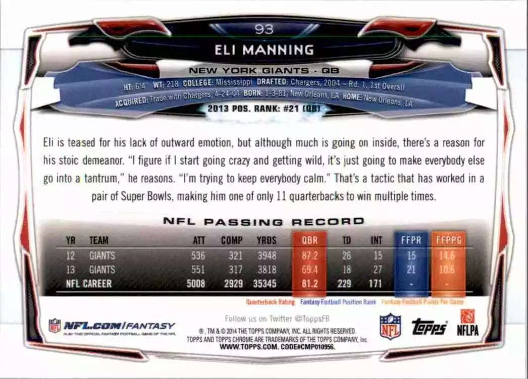 Eli Manning 2014 Topps Chrome Series Mint Card #93