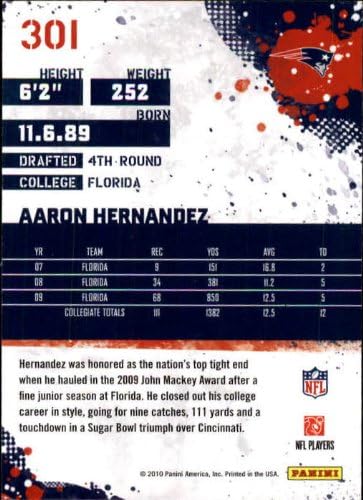 Aaron Hernandez 2010 Score Football Series Mint Rookie Card #301 picturing Him in his White New England Patriots Jersey
