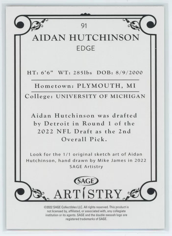 Aidan Hutchinson 2022 Sage Artistry Series Mint Rookie Card #91