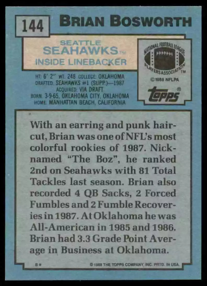 Brian Bosworth 1988 Topps Series Mint Rookie Card #144