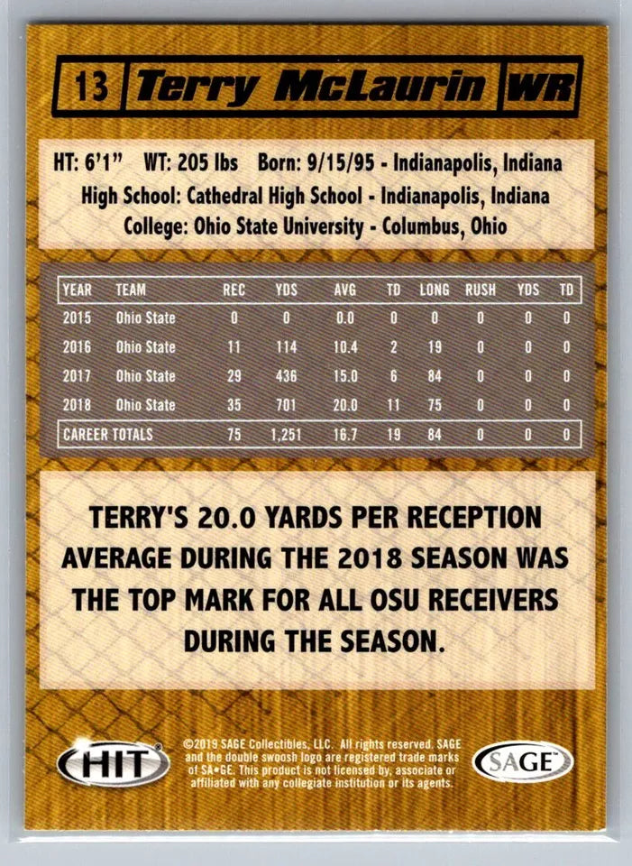 Terry McLaurin 2019 SAGE HIT Series Mint Card #13