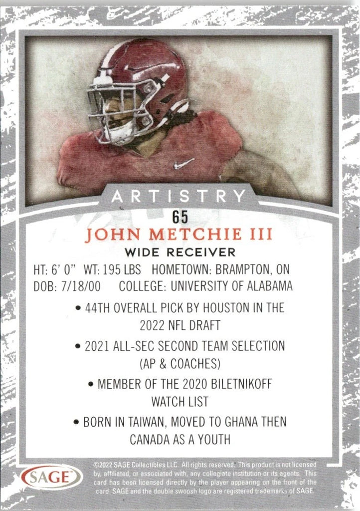 John Metchie III 2022 Sage Artistry Series Mint Rookie Card #65