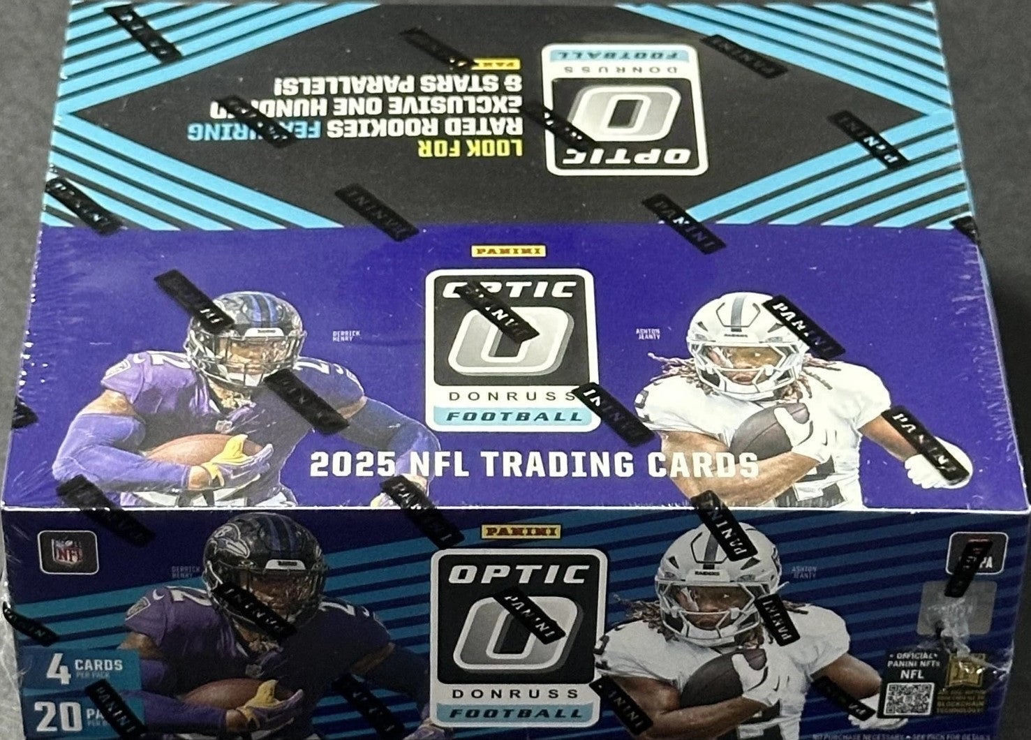 This is a Brand New 2025 Panini Donruss OPTIC NFL Football Factory Sealed Unopened RETAIL Box that contains 20 packs of 4 cards for a total of 80 cards in all including possible Retail EXCLUSIVE Rated Rookies Stars and 100 Hundred Parallels and Chance for Ultra Rare Downtown Inserts, Autographs and Memorabilia Cards!