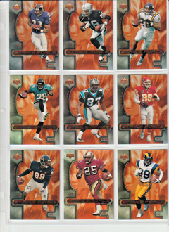 This is the 2000 Upper Deck Strike Force complete mint 15 card insert set; it was never issued in factory form. Featuring Fred Taylor, Muhsin Muhammad, Tony Gonzalez, Marcus Robinson, Charlie Garner, Torry Holt, Germane Crowell, Amani Toomer, Patrick Jeffers, Albert Connell, Olandis Gary, Robert Smith, Napoleon Kaufman, Tshimanga Biakabutuka and Priest Holmes.