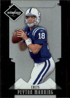 This is the 2008 Leaf Limited Football series 100 card complete mint basic hand collated set; it was never issued in factory form. Loaded with stars including Adrian Peterson, Tony Romo, Ben Roethlisberger, Brett Favre, Peyton Manning, Eli Manning, Tom Brady, Aaron Rodgers, LaDainian Tomlinson, Reggie Bush, Randy Moss, Carson Palmer, Terrell Owens, Donovan McNabb, Joseph Addai, Kurt Warner, Jay Cutler and many others!