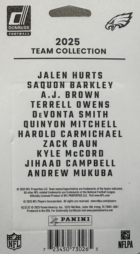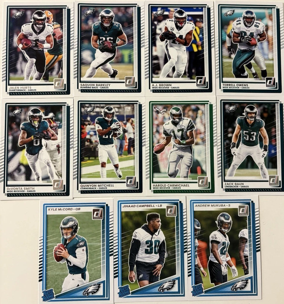 This is a Philadelphia Eagles 2025 Donruss factory sealed 11 card team set including Saquon Barkley, Jalen Hurts, A.J. Brown, Terrell Owens, DeVonta Smith, Quinyon Mitchell, Harold Carmichael, Zack Baun, plus Rated Rookie cards of Kyle McCord, Jihaad Campbell and Andrew Mukuba.