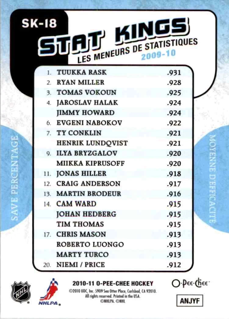 Tuukka Rask 2010 2011 O-Pee-Chee Stat Kings Card #SK18