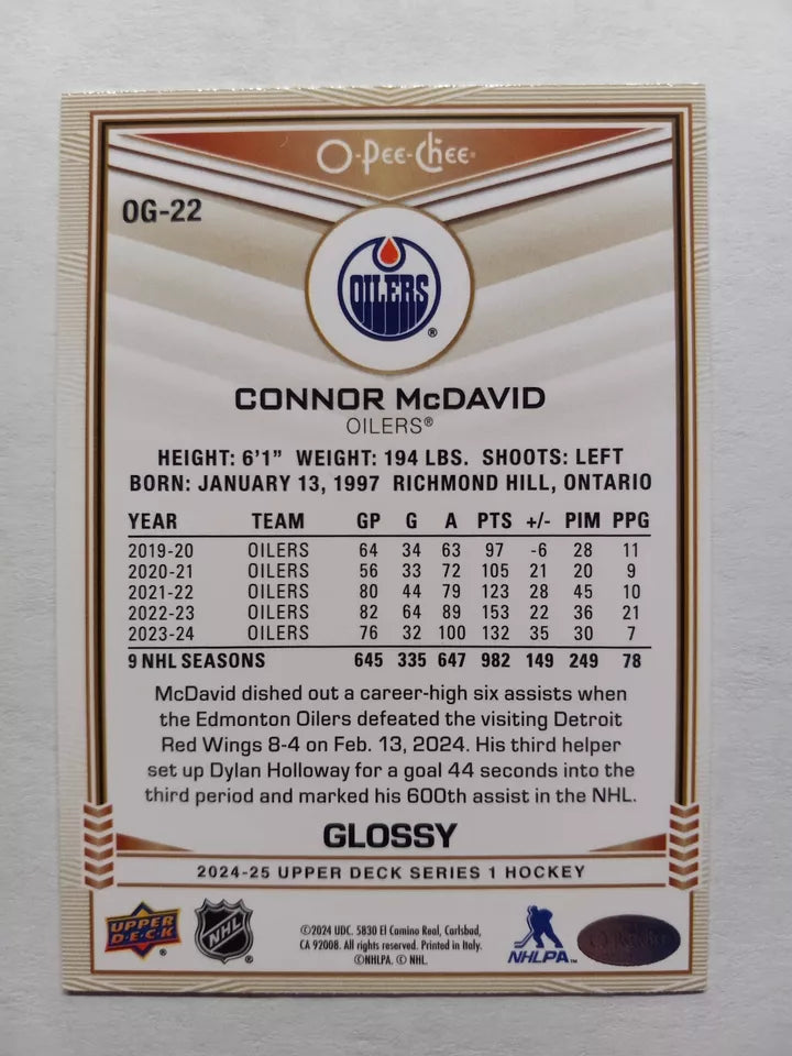 Connor McDavid 2024 2025 Upper Deck O-Pee-Chee Glossy Series Mint Card #OG-22