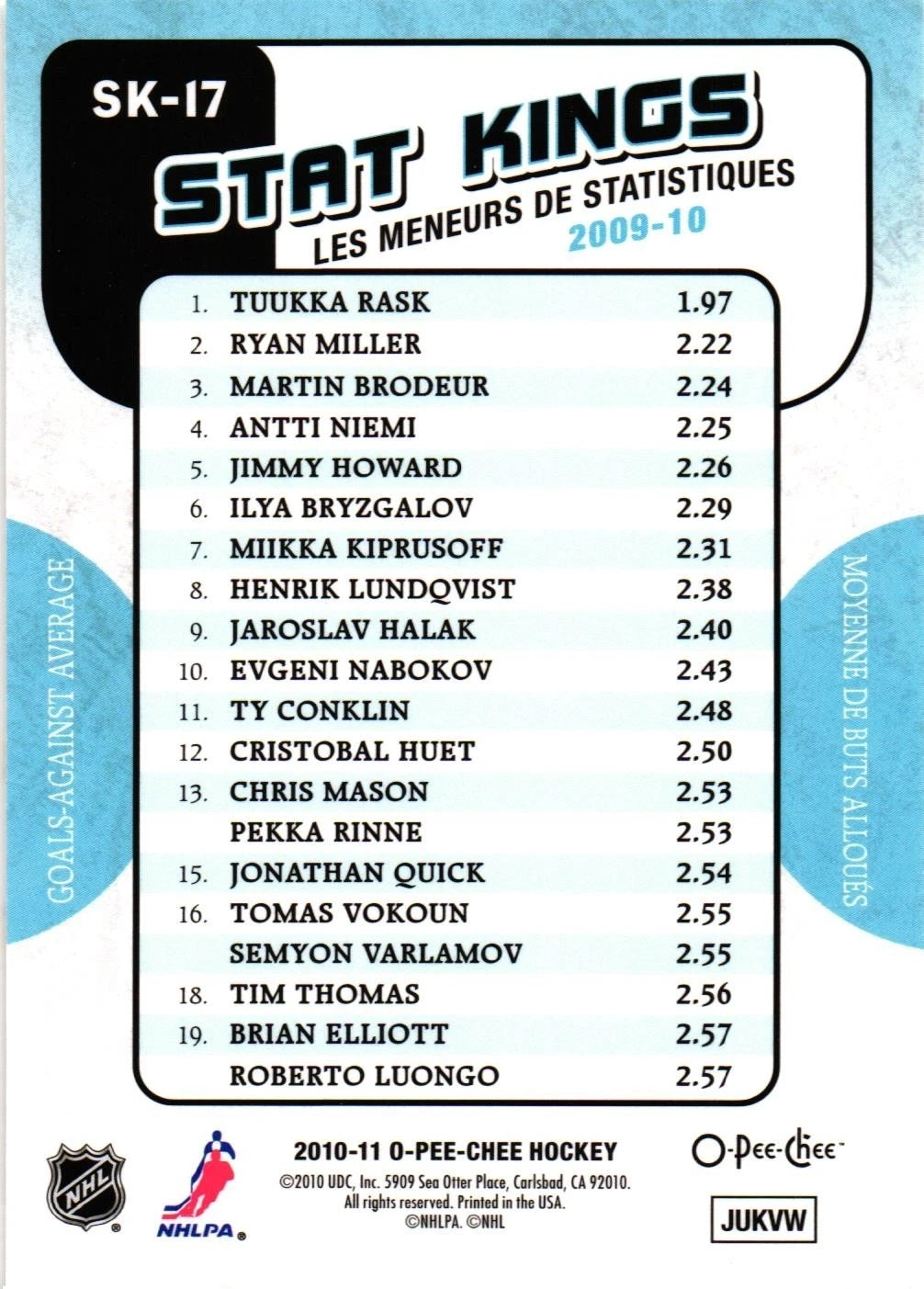 Tuukka Rask 2010 2011 O-Pee-Chee Stat Kings Card #SK17
