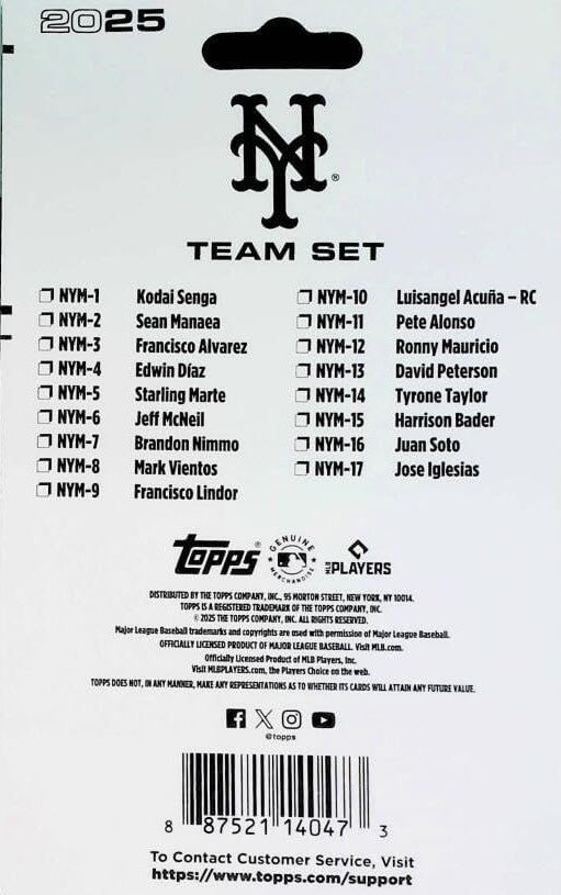 New York Mets 2025 Topps Factory Sealed 17 Card Team Set Featuring Francisco Lindor, Pete Alonso, Juan Soto and Luisangel Acuna Rookie Card Plus