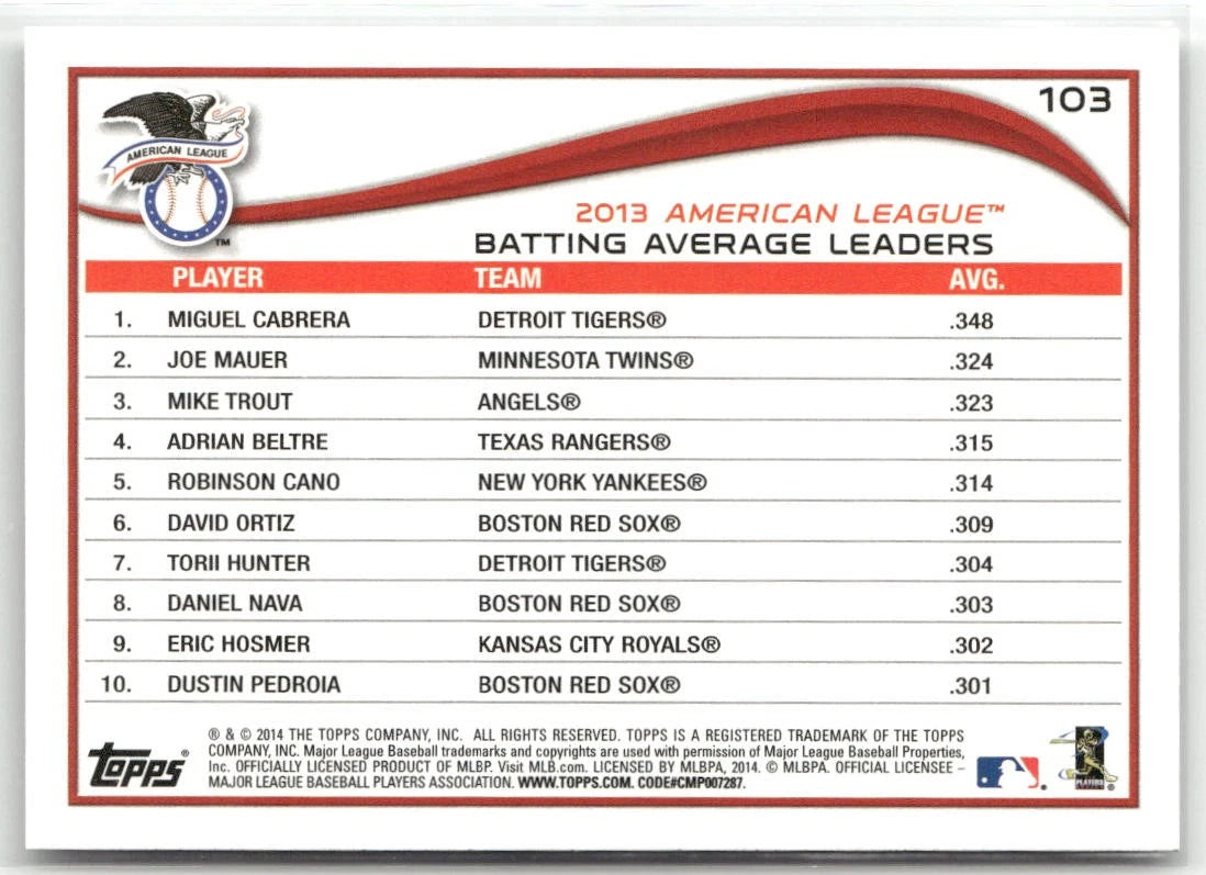 Miguel Cabrera / Joe Mauer / Mike Trout 2014 Topps Series Mint Card #103