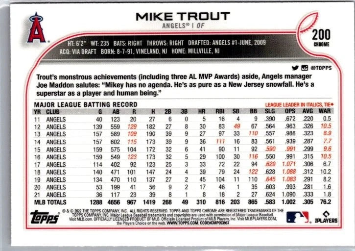 Mike Trout 2022 Topps Chrome Pink Series Mint Card #200