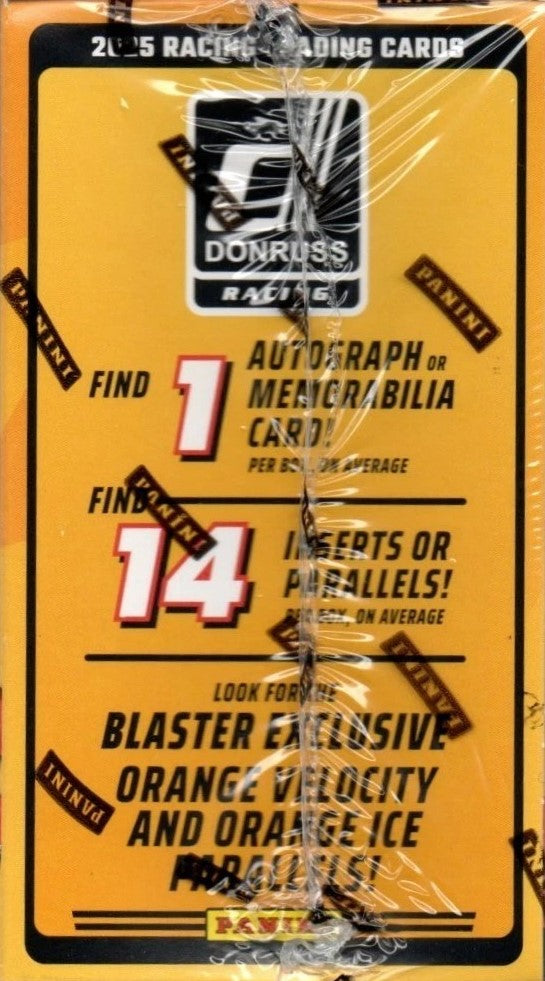 This is a brand new 2025 Donruss NASCAR Racing Series Unopened Blaster Box that contains 56 cards per box. Each box contains 7 packs of 8 cards including 1 Autograph or Memorabilia card per box on average plus 14 inserts or parallel cards including Possible Orange Velocity and Ice Versions.
